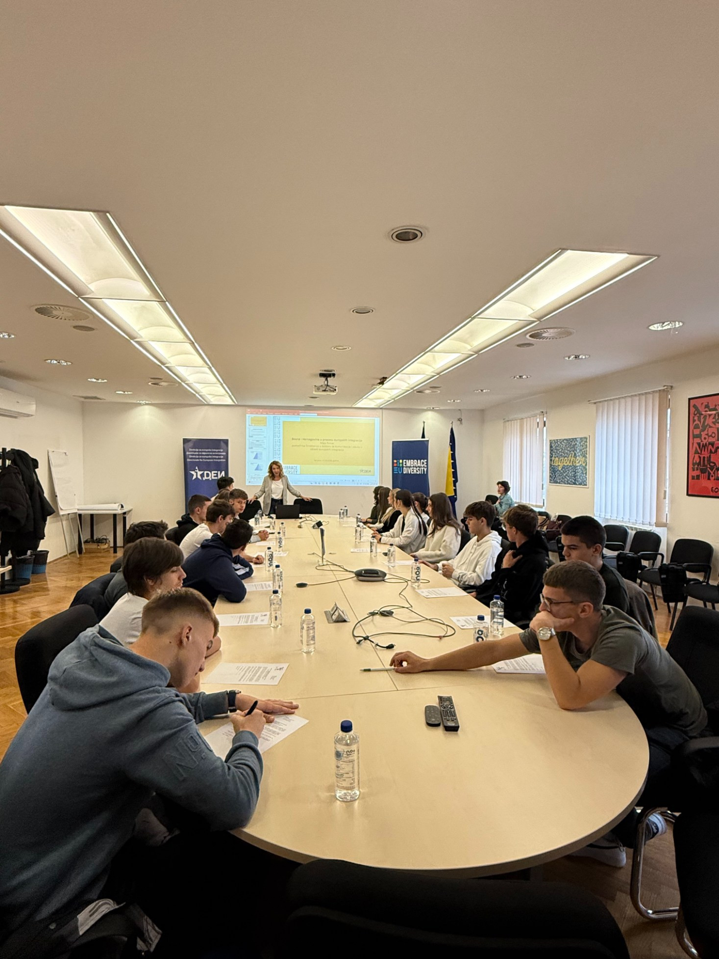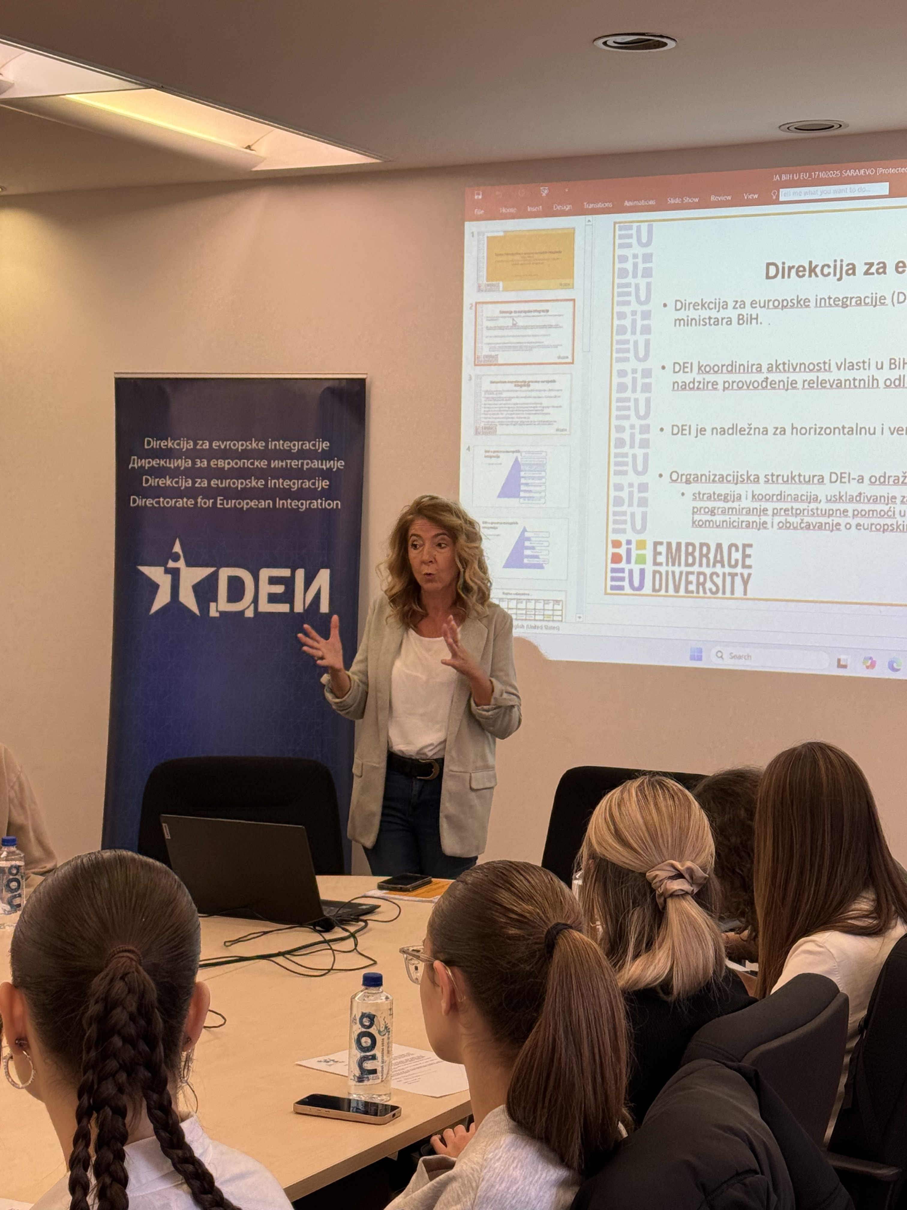 Tokom susreta, Maja Rimac, pomoćnica Direktora u Sektoru za komunikacije i obuke u oblasti evropskih integracija, predstavila je ulogu i nadležnosti DEI-a, objašnjavajući kako ova institucija koordinira i prati proces pristupanja BiH Evropskoj uniji. Učesnici su se upoznali sa mehanizmom koordinacije procesa evropskih integracija, kako izgleda saradnja između različitih nivoa vlasti u BiH, te na koji način se usklađuju stavovi i prioriteti u odnosu na EU agendu.