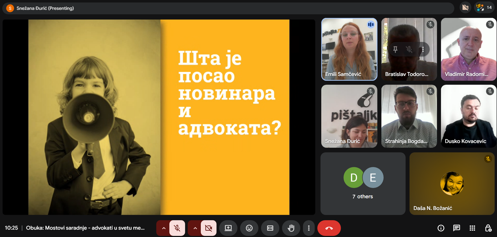 Obuka „Mostovi saradnje: Advokati u svetu medija – od javnog govora do zaštite izvora” na temu pristupa informacijama od javnog značaja i zaštite izvora održana je u utorak u Beogradu. Na ovoj obuci, koja je okupila advokate i stručnjake iz oblasti slobode izražavanja, predstavljeni su načini dobijanja zvaničnih podataka pomoću Zakona o slobodnom pristupu informacijama od javnog značaja i standardi odgovornog izveštavanja kroz studiju slučaja iz prakse Pištaljke.