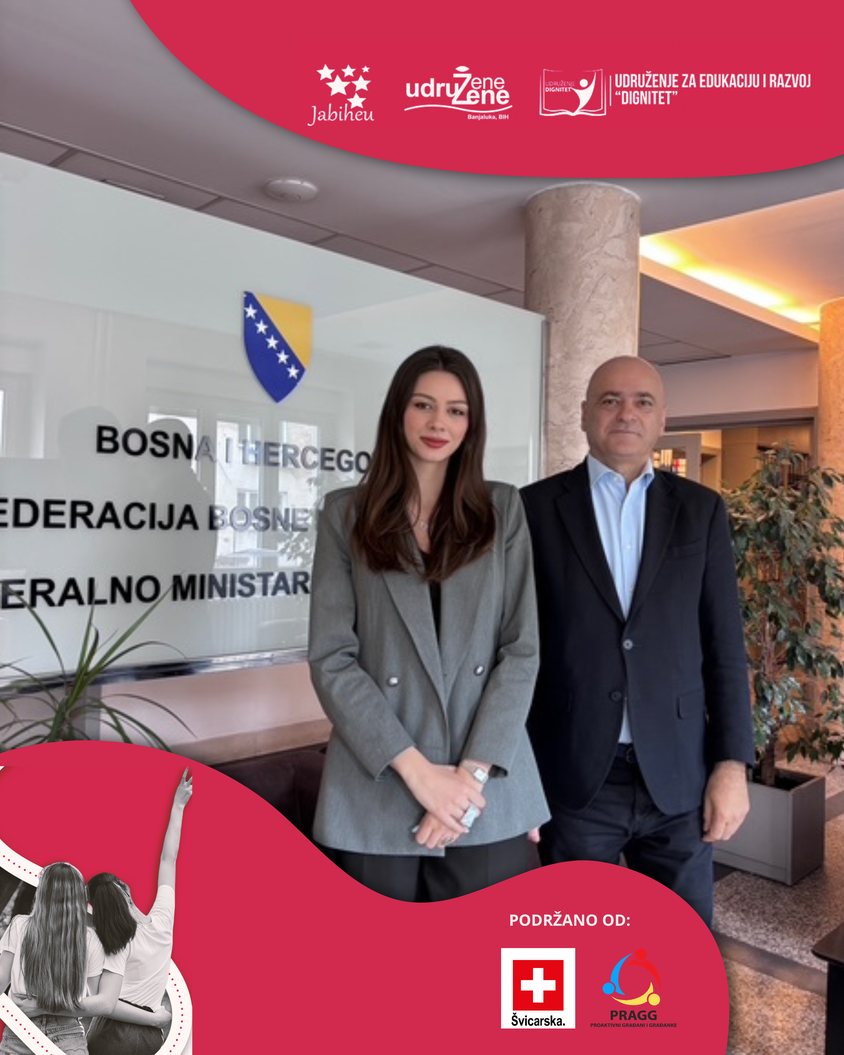 U okviru projekta “Od klupe do zakona – za dostupno menstrualno zdravlje” održan je sastanak sa g. Goranom Čerkezom, pomoćnikom ministra za javno zdravlje u Federalnom ministarstvu zdravstva, te Adisom Mehić, šeficom Odsjeka za normativno-pravne poslove, uz prisustvo projektne menadžerice Lare Sutović ispred Udruženja JaBiHEU.